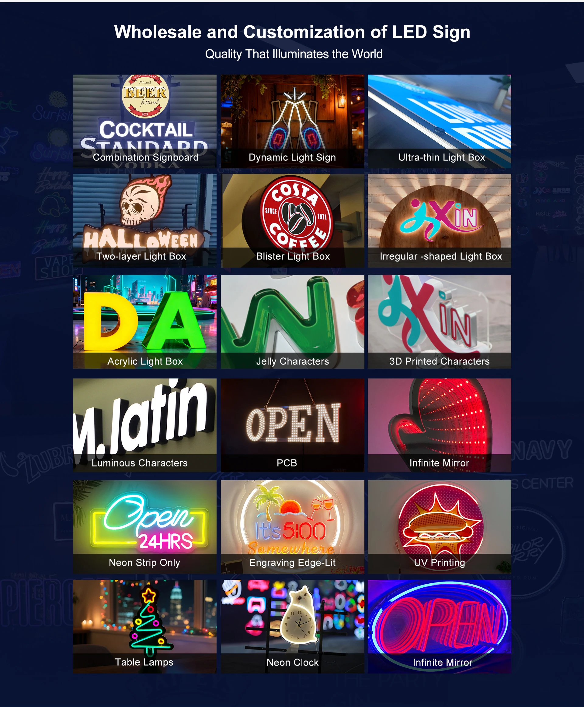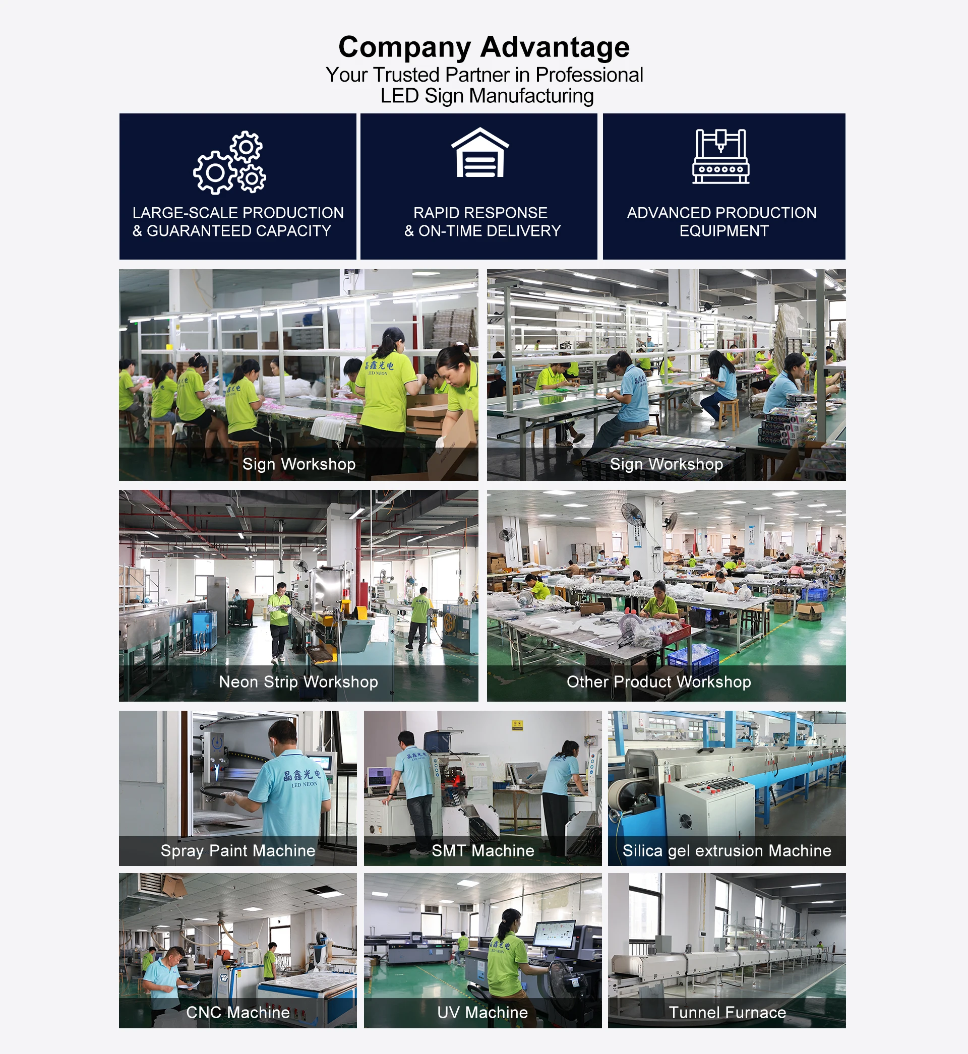 Основные продукты:Неоновый знак, светодиодные полосы, неоновые огни, неоновые зеркала, световой короб